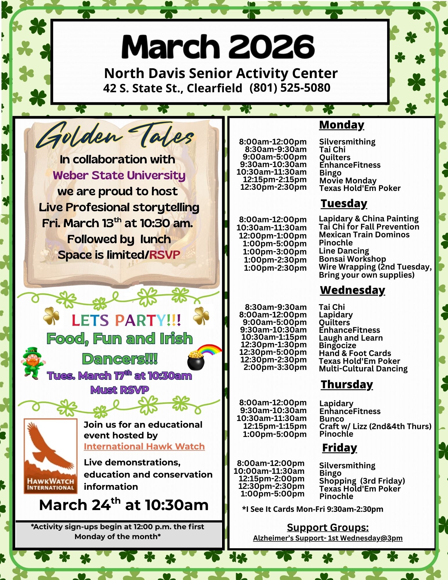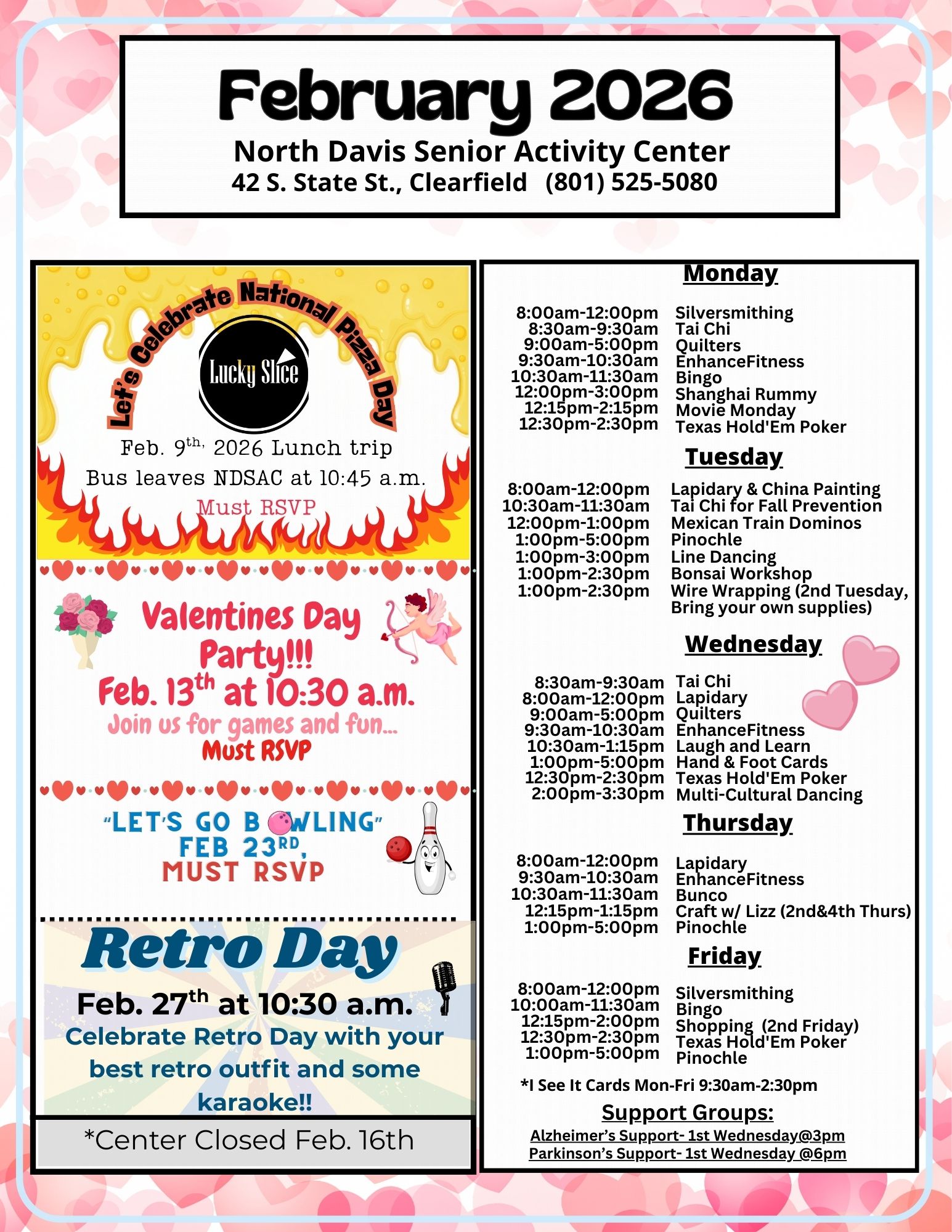 The North Davis Senior Activity Center in Clearfield, Utah, serves seniors in Clearfield, northern Layton, South Weber, Syracuse, Clinton, Sunset, and West Point. Our center offers a comprehensive range of programs to enlighten, educate and enrich the lives of active adults age 60 and over. We provide a welcoming space for seniors to socialize and participate in a variety of fun activities such as exercise classes, card games, educational classes, crafting, outings, and much more.
